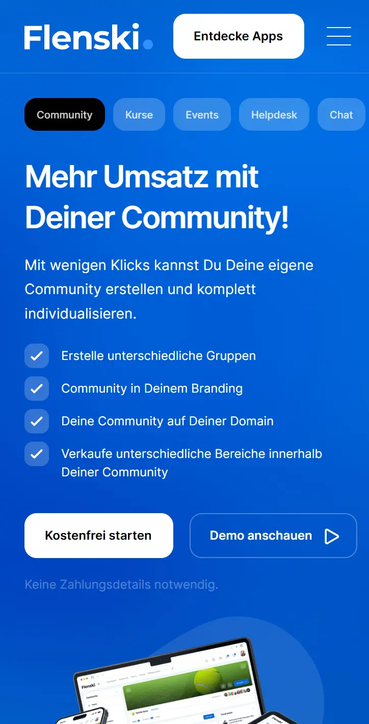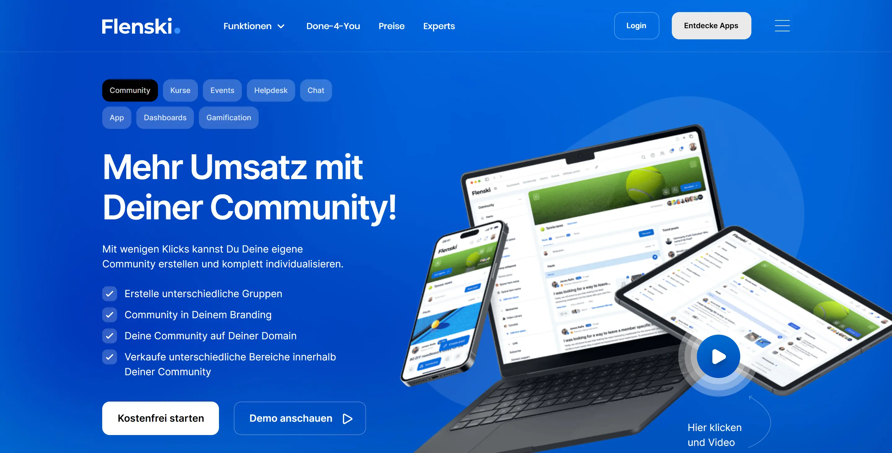 Flenski wird als All-in-One Member-Software vermarktet: Community, Gruppen, Inhalte, Kurse, Events, Chat und Support an einem Ort. Wenn du Tarife, Funktionen, Demo-Ansichten und Verfügbarkeit sehen möchtest, nutze den offiziellen Link.